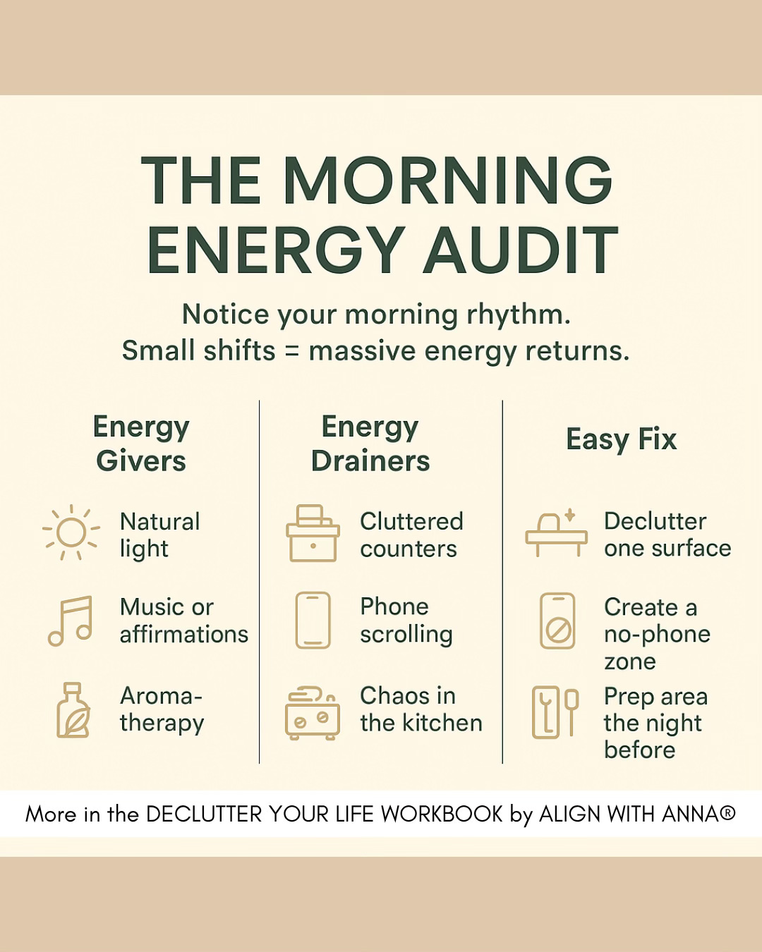 A cluttered space is loud energy. Every unmade decision — that drawer you avoid, that pile you don’t deal with — drains you quietly.